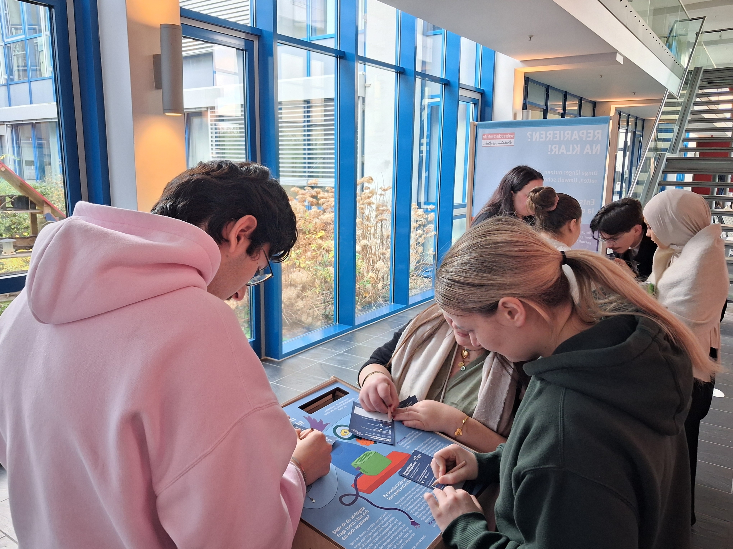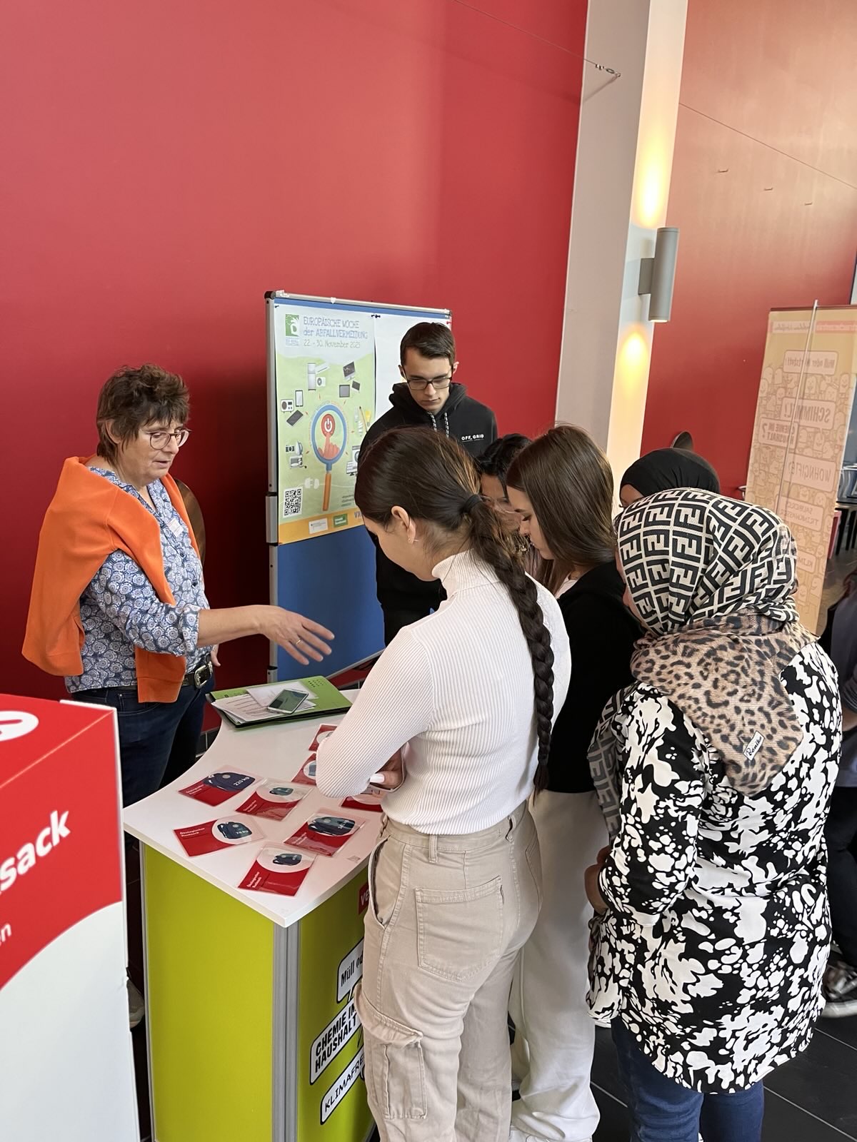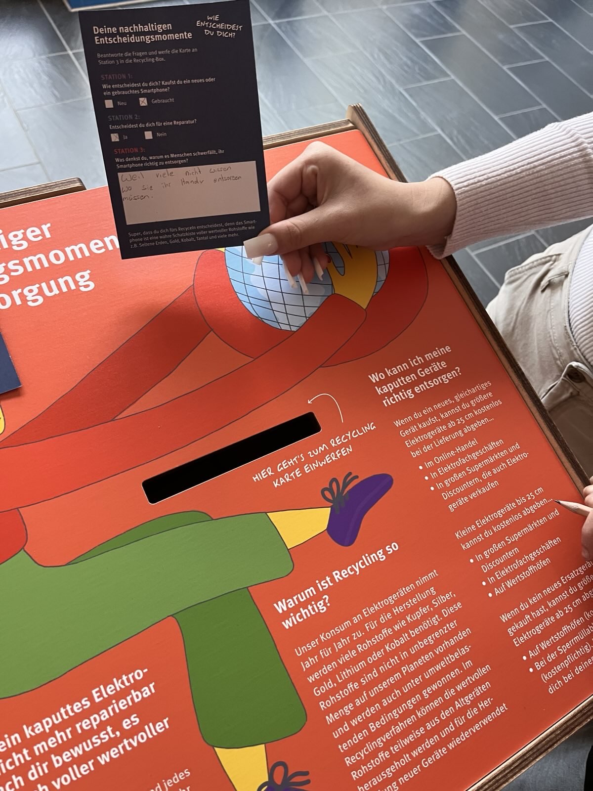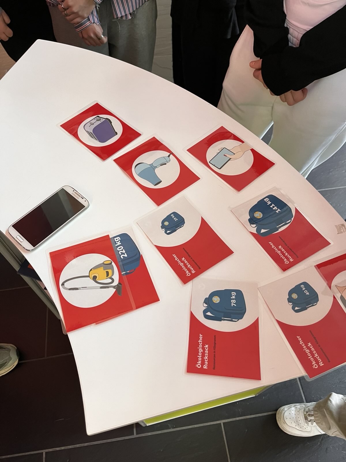 In der interaktiven Ausstellung der Umweltberatung der Verbraucherzentrale Unna zum Thema „Nachhaltiger Umgang mit Elektrogeräten“ haben die Schüler*innen der Sozialassistent*innen (Oberstufe) und die angehenden Erzieher*innen (Unterstufe) ihr eigenes Konsumverhalten im Umgang mit Elektrogeräten reflektiert und im Sinne der Nachhaltigkeit Entscheidungen getroffen.